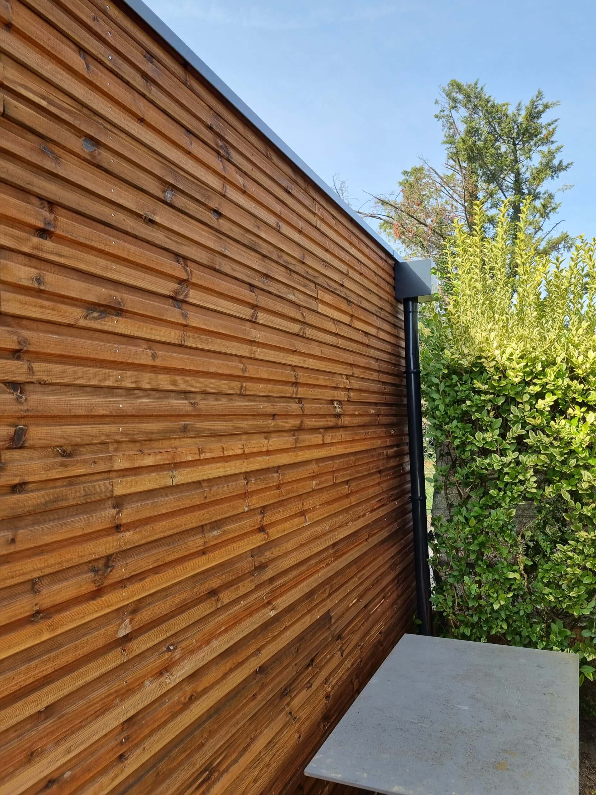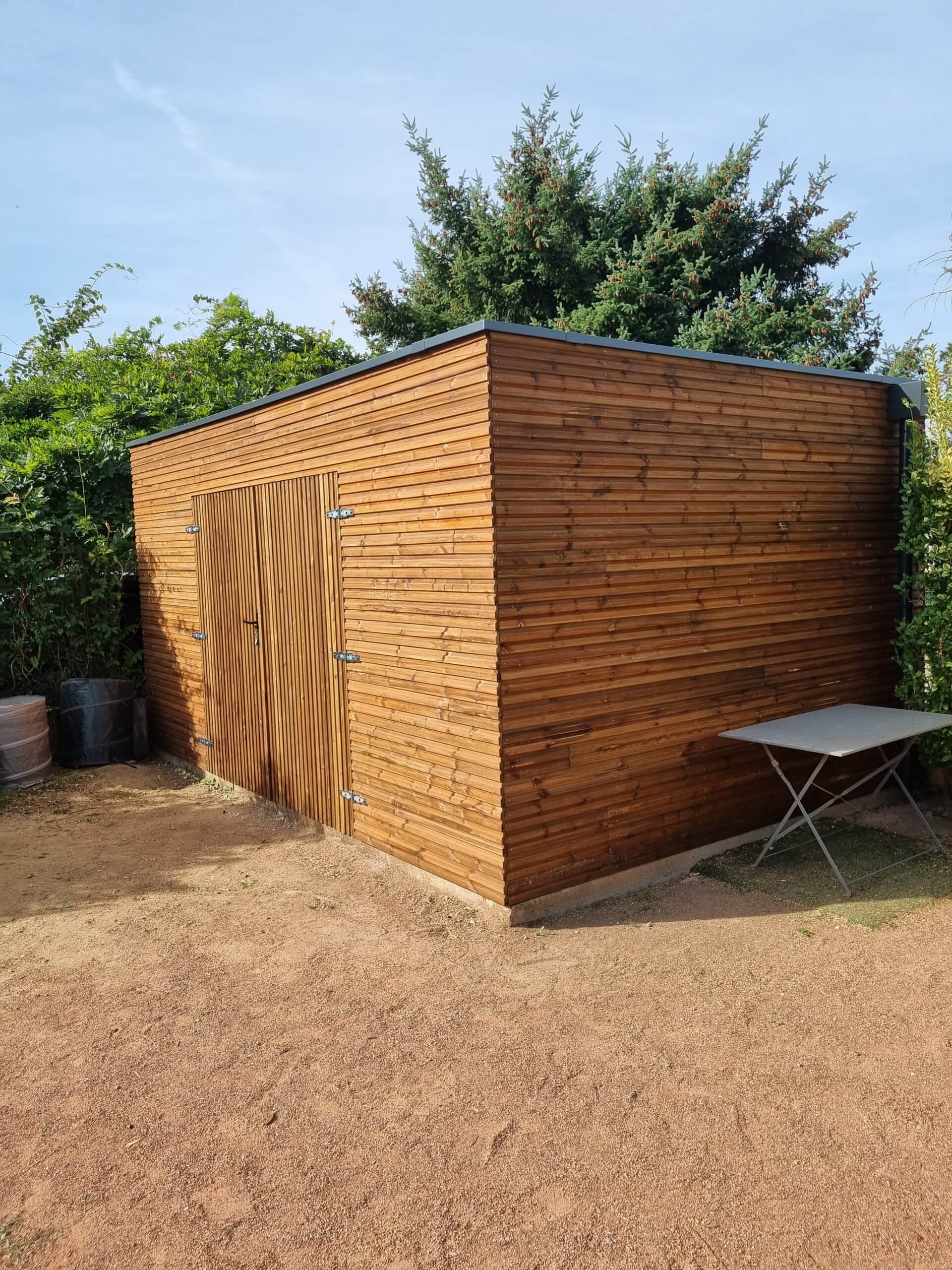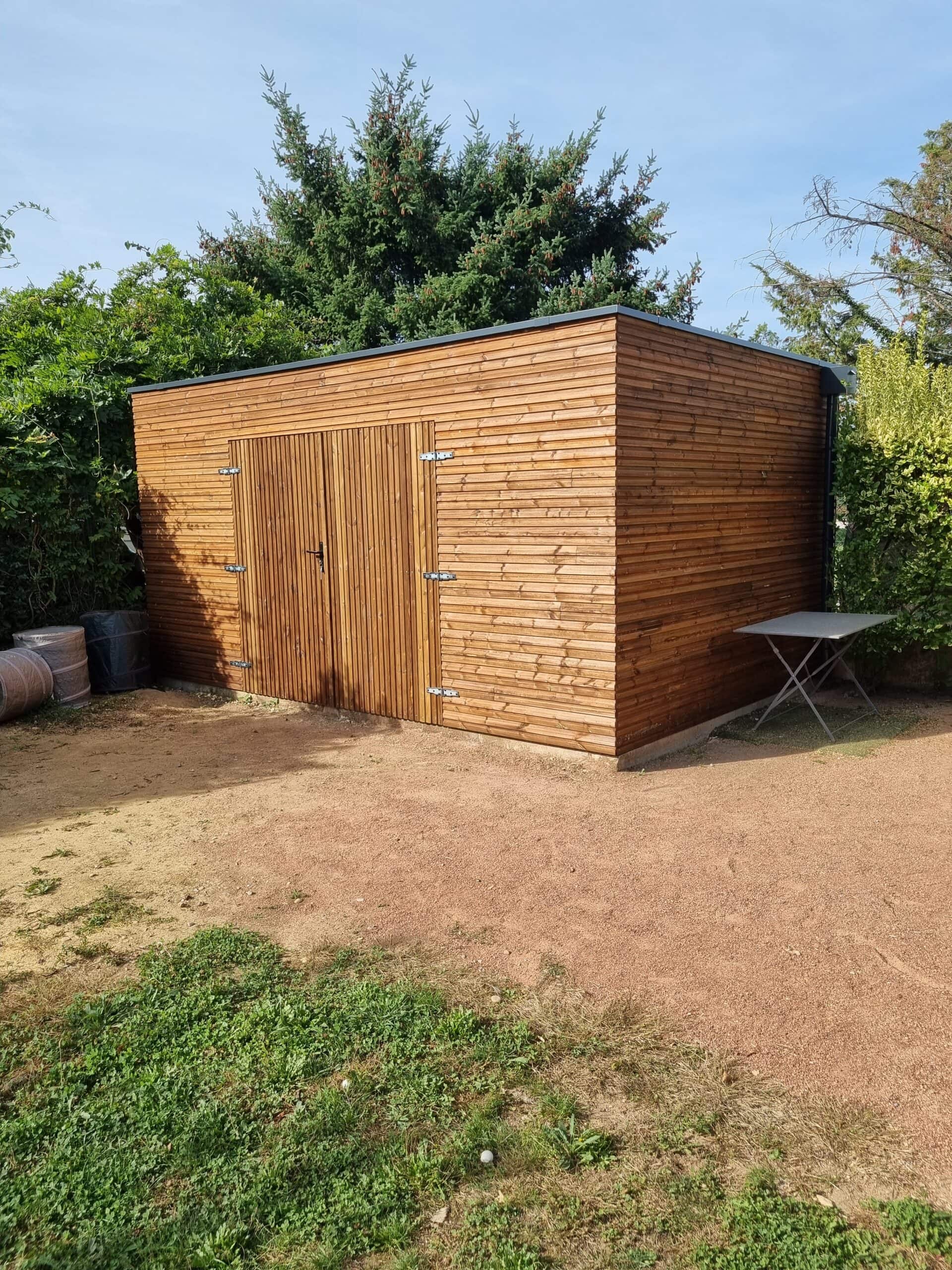 Garage ossature bois bardage pin autoclave marron et toit plat
