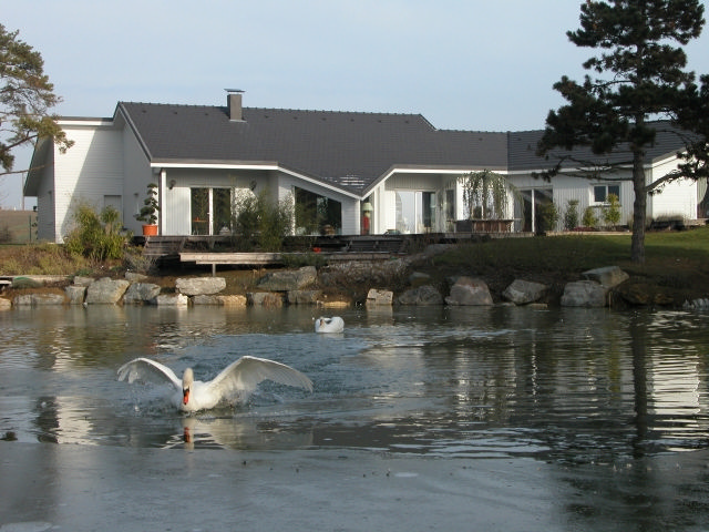 Maison d’architecte avec bardage bois compressé, menuiseries aluminium et couverture tuiles mécaniques terre cuite.